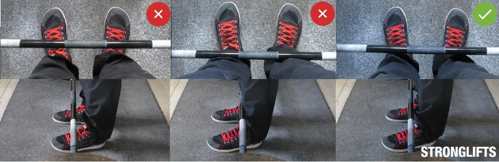 When you line up with the bar you want to make sure the bar is directly over your mid foot. I like to use the part of my shoelaces where you tie the knot as a reference for where the mid foot is. The bar should be covering this. Once in this position the bar should be 1 to 2 inches away from your shins.